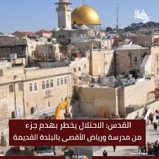 أخطرت بلدية الاحتلال الإسرائيلي، بهدم جزء من مدرسة ورياض الأقصى فرع “المئذنة الحمراء” في حارة السعدية بالبلدة القديمة من القدس المحتلة.
